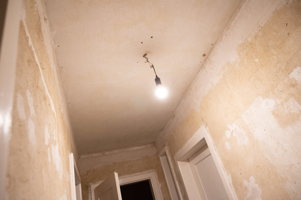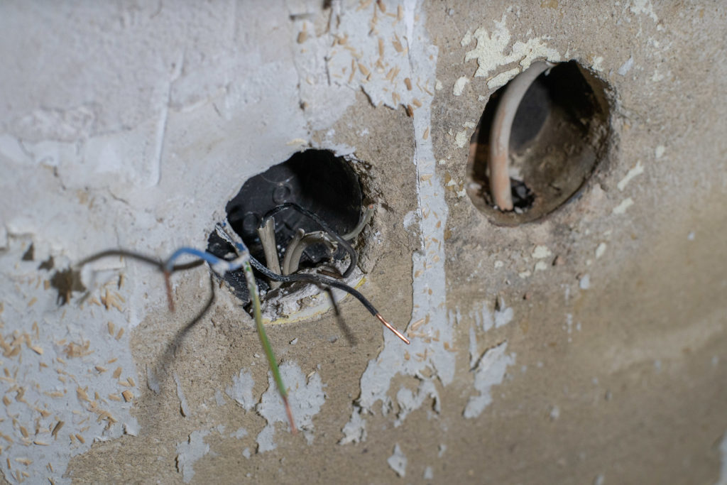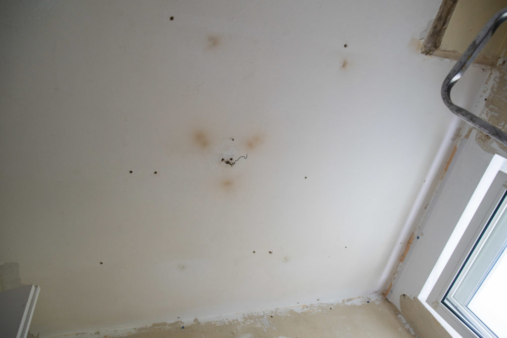 Wir waren erstaunt, was sowohl unter den Holzpaneelen an der Decke als auch unter den Tapeten so alles zum Vorschein kam. Wir entdeckten gefühlte 1000 Dübellöcher mit äußerst widerspenstigen Dübeln, aber auch Elektroleitungen, die sich ohne Abdeckung in der Verteilerdose befanden. Sicherheitsstandards sind eigentlich sinnvoll, nur sieht das wohl nicht jeder so. In der Küche war die Holzpaneeldecke mit Deckenspots versehen. Unter Brandschutz- und Sicherheitsaspekten ist das keine gute Idee und auf dem Bild könnt Ihr auch erkennen, dass diese Spots und der zugehörige Trafo entsprechende Spuren hinterlassen hatten. Bloß weg mit diesem veralteten Baumaterial!