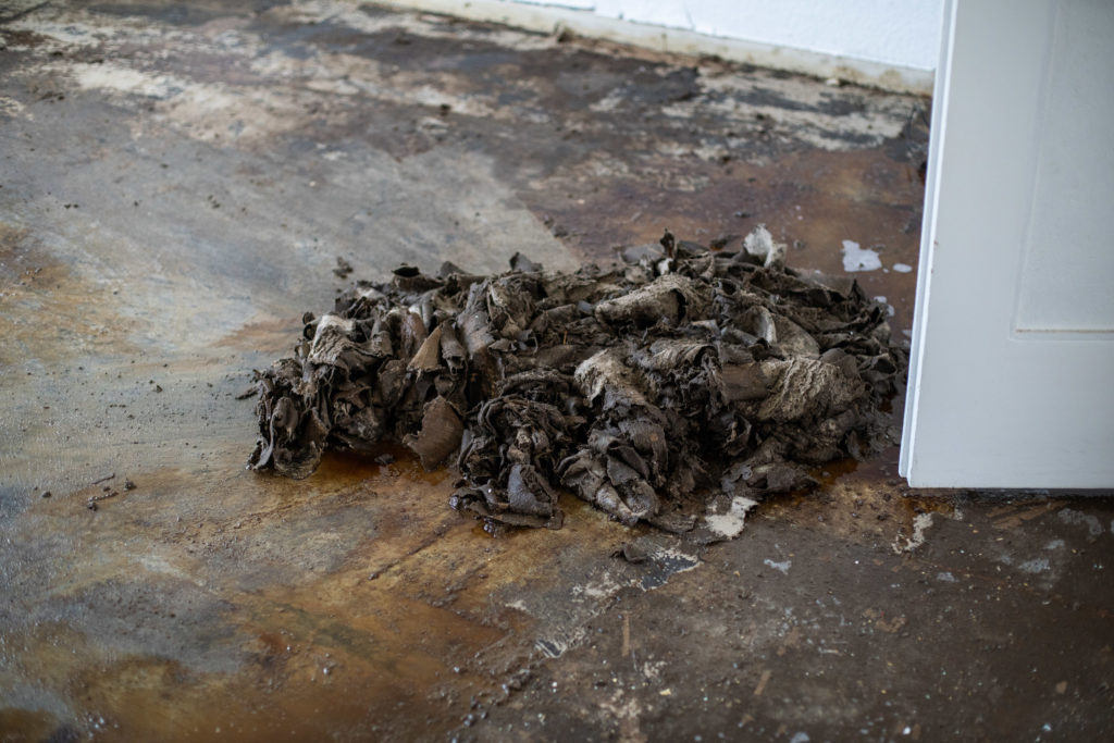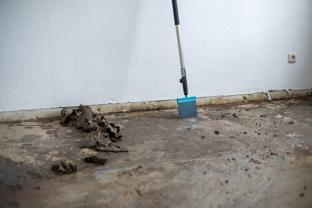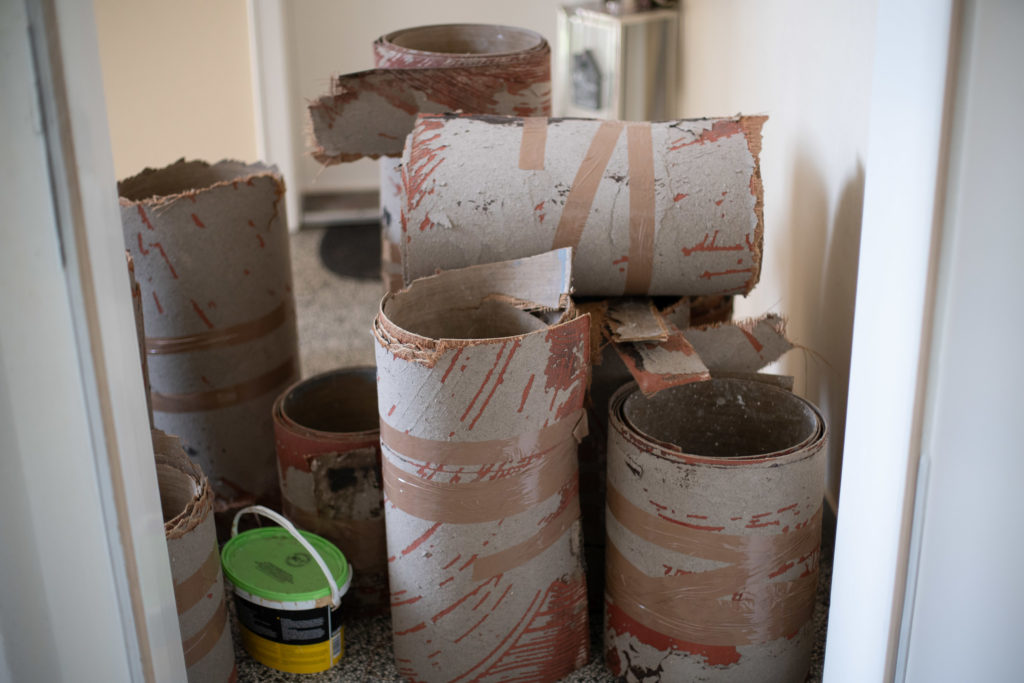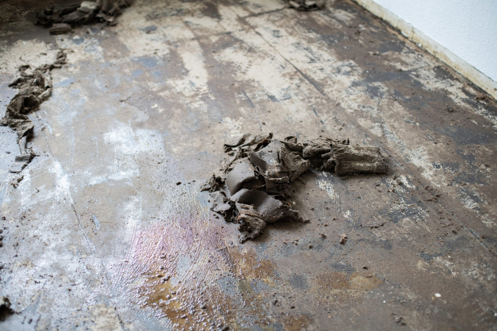 Nun ging es dem Linoleum an den Kragen. Die oberste Schicht schnitten wir mit dem Cuttermesser in händelbare Bahnen und rollten den Boden einfach auf. Nach all den Jahren hatte sich allerdings die Pappschicht sehr gut mit dem Boden verbunden, sie sind richtig gute Freunde geworden. Wir haben uns schon auf allen Vieren durch die Wohnung kriechen sehen, um Zentimeter für Zentimeter abzukratzen. Letztlich testeten wir dann einfach mal, was passiert, wenn man die Pappe ordentlich einweicht. Und siehe da: Großzügiges Gießen und eine Einwirkzeit von ca. 3 Stunden half uns! Am Ende konnten wir mit einem geschliffenen Eiskratzer das nasse Zeug bequem abschaben.